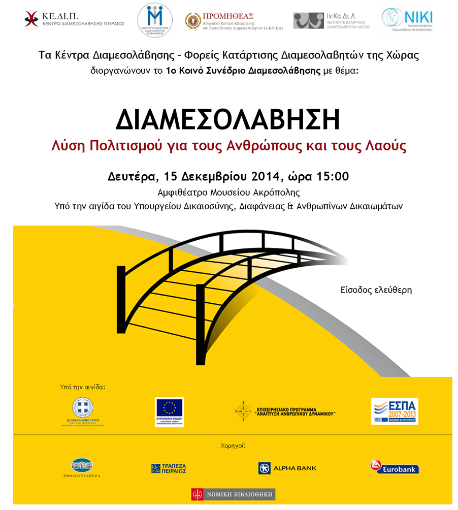1o Kοινό Συνέδριο Κέντρων Διαμεσολάβησης - Φορέων Κατάρτισης Διαμεσολαβητών με θέμα: «Διαμεσολάβηση- Λύση Πολιτισμού για τους Ανθρώπους και τους Λαούς»