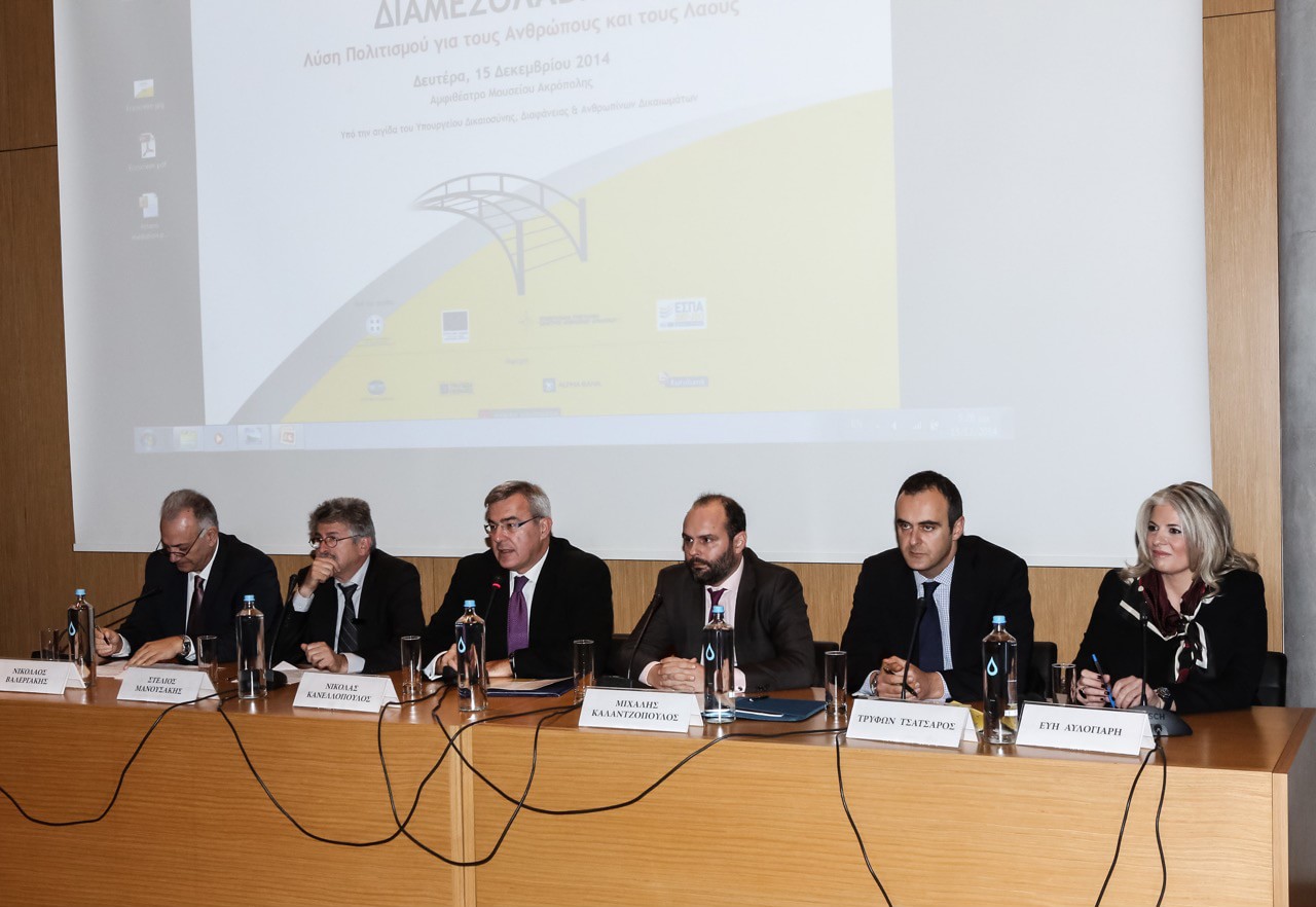 Ο Γενικός Γραμματέας του Υπουργείου Δικαιοσύνης, Διαφάνειας και Ανθρωπίνων Δικαιωμάτων κ. Νικόλας Κανελλόπουλος απηύθυνε χαιρετισμό, υπογραμμίζοντας τη σημασία που προσδίδει η Πολιτεία στις εναλλακτικές μεθόδους επίλυσης των διαφορών, καθώς και την προστιθέμενη αξία που η Διαμεσολάβηση μπορεί να προσφέρει στην Ελληνική Δικαιοσύνη και την Κοινωνία: «Απαντώντας στα σημεία των καιρών, η Διαμεσολάβηση προωθεί ένα σύγχρονο τρόπο ζωής, σκέψης και δράσης για όλους τους πολίτες, μέσα σ’ ένα σύγχρονο, φιλικού προς τον άνθρωπο κοινωνικό περιβάλλον. Σηματοδοτεί διεθνώς ένα νέο δρόμο για τη Δικαιοσύνη, την επιχειρηματικότητα, την Οικονομία και την Κοινωνία μας. Είναι μια επιλογή βαθιά πολιτισμένη, σύμφυτη με το ανθρώπινο πνεύμα, ενδεικτική ενός νέου, ανοικτού και συμμετοχικού κοινωνικού πολιτισμού.».
