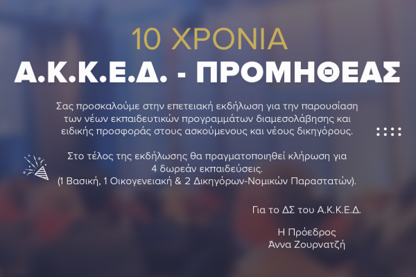 Το Αθηναϊκό Κέντρο Κατάρτισης και Εκπαίδευσης Διαμεσολαβητών Α.Κ.Κ.Ε.Δ. – «ΠΡΟΜΗΘΕΑΣ», διοργανώνει τη Δευτέρα 19 Σεπτεμβρίου 2022 και ώρα 18.00, στην αίθουσα εκδηλώσεων του ΔΣΑ «Μ. Επαμ. Ζαφειρόπουλος», επετειακή εκδήλωση για την 10ετή λειτουργία του, όπου θα παρουσιαστούν τα νέα εκπαιδευτικά προγράμματα διαμεσολάβησης και θα ανακοινωθεί ειδική προσφορά για τους ασκούμενους και νέους δικηγόρους.
